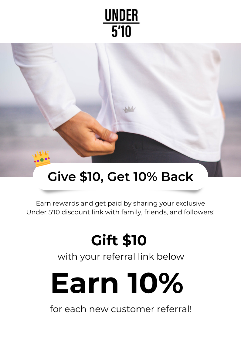 You can now earn rewards and get paid by sharing your exclusive Under 5'10 discount link with family, friends, and followers.